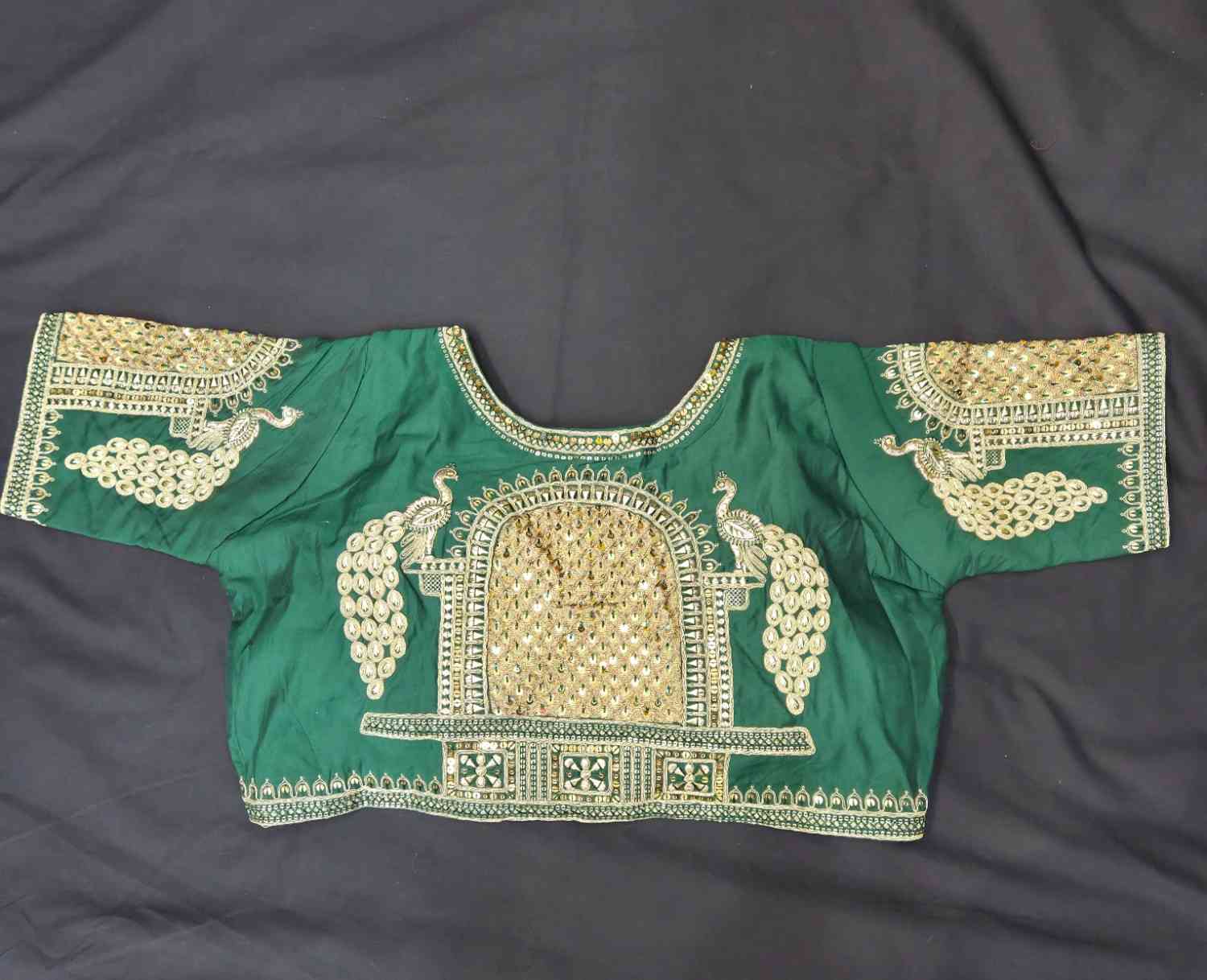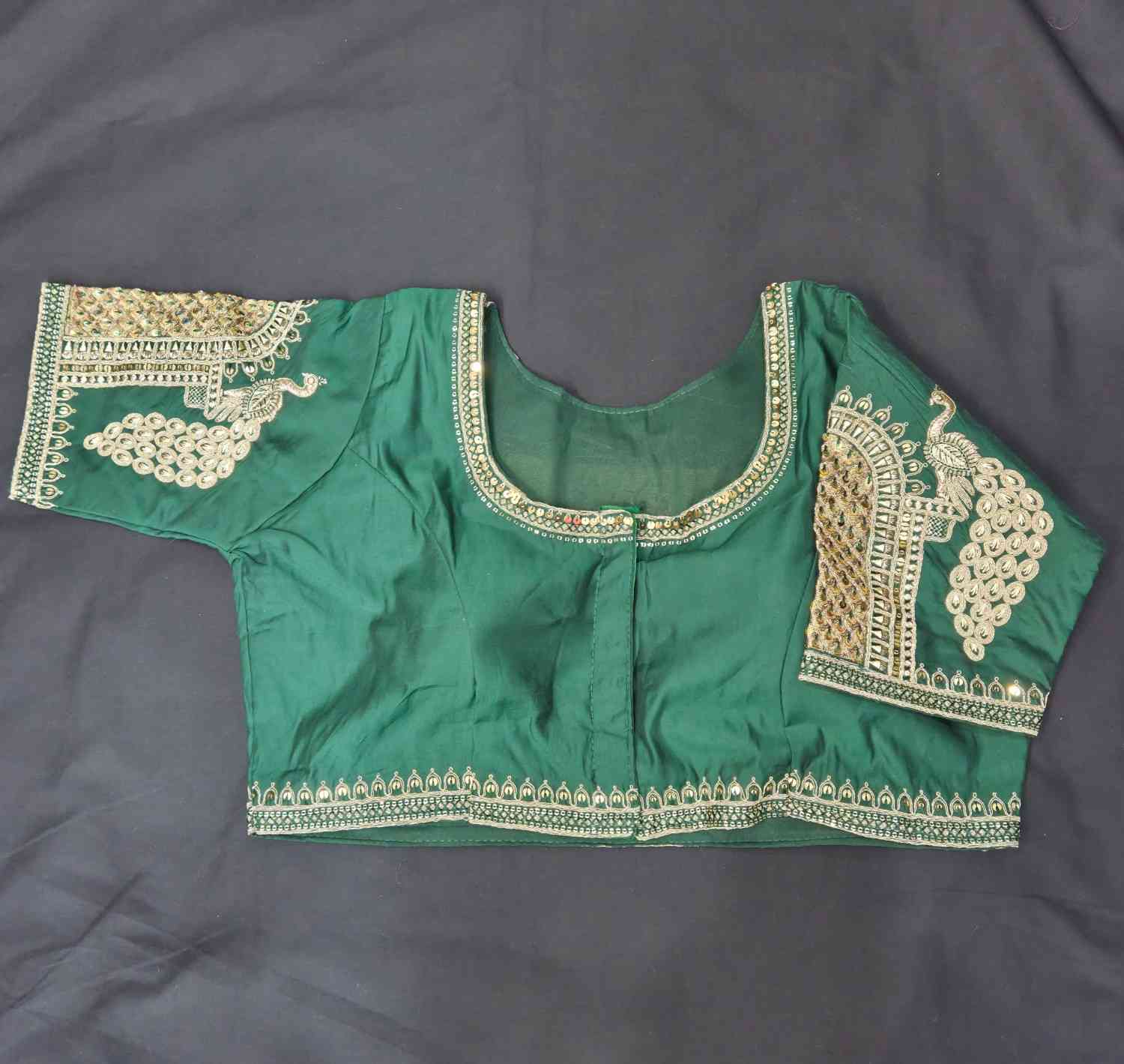 Beautiful Hand Embroidery Bottle Green Color Peacock Design Blouse.