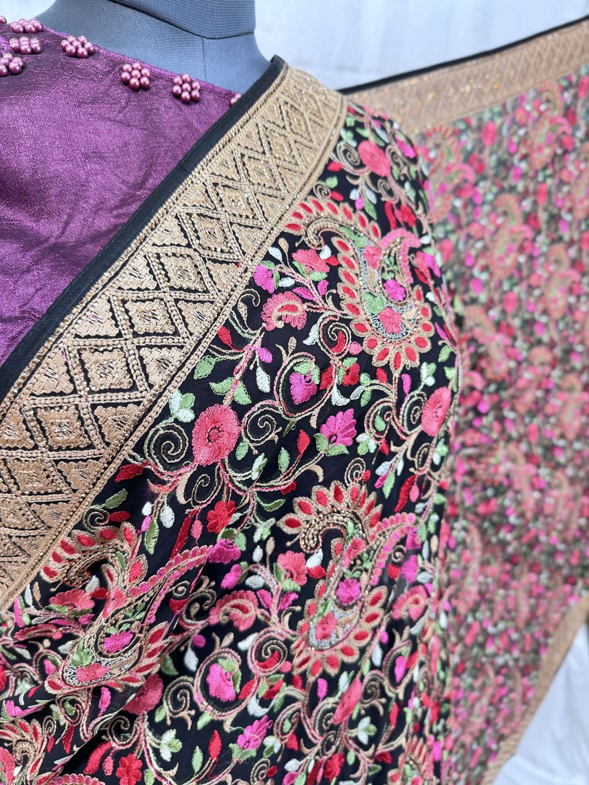 BEAUTIFUL PURE GEORGETTE BRIDAL OR PARTY WEAR DESIGNER JAL WORK SAREE WITH MUTICOLOR HEAVY EMBROIDERY AND STONE WORK COMES WITH UNSTICHED BLOUSE.