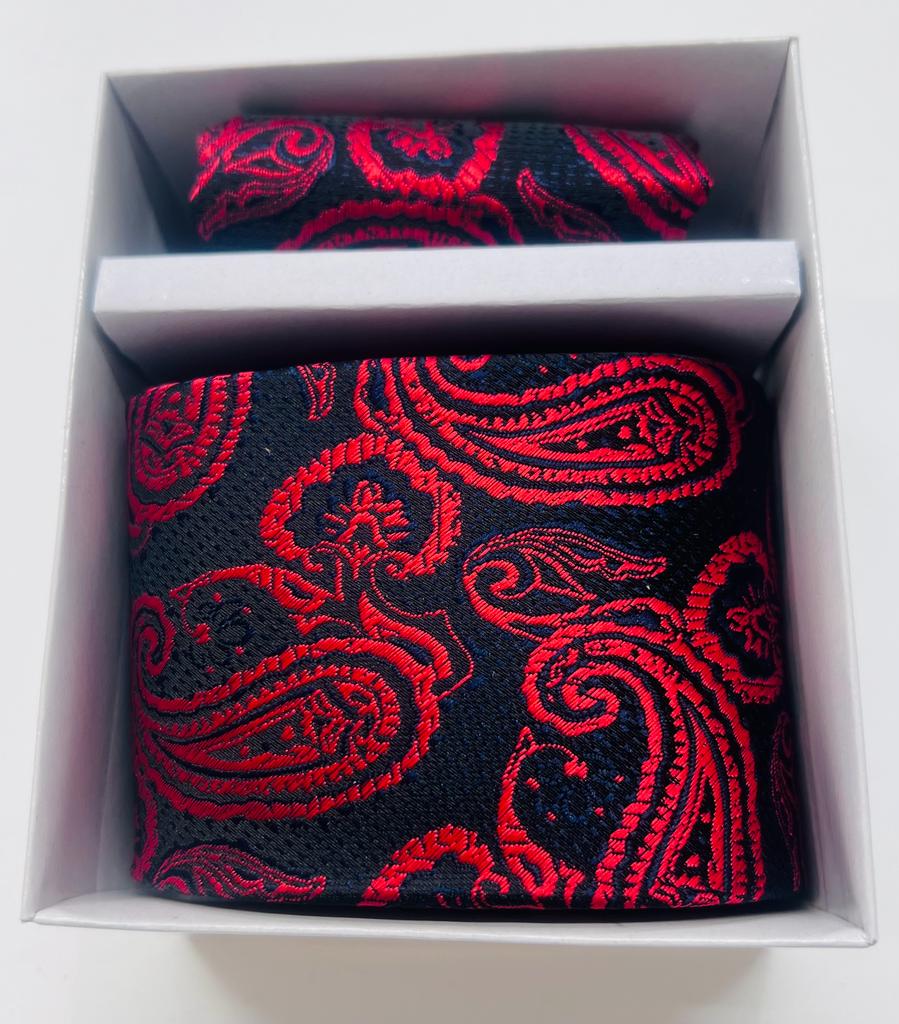 This paisley tie in dark blue and red is a classy take on the traditional dark blue tie. The best way to view the image is in dimming light.