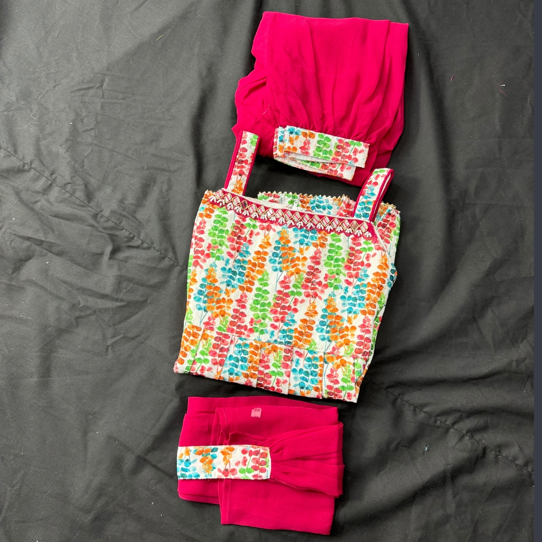 Designer 3 Piece Suit Hot Pink Color Pure Georgette Fabric Embroidery Sequence, Mirror And Pearl Work On Neck Comes With Matching Dupatta.