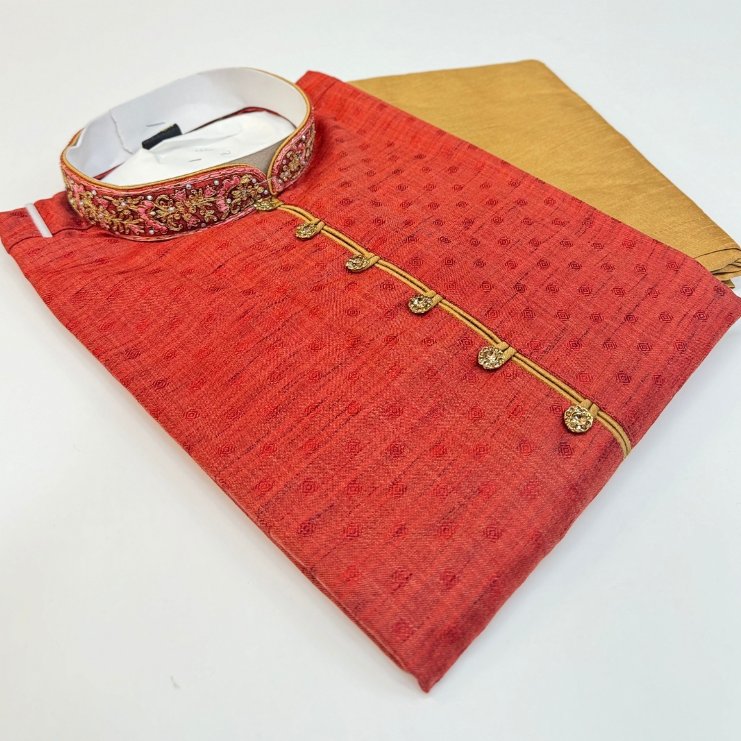 Be the first to review “Designer Kurta Soft Silk Fabric Maroon Color With Neck Work And Stone Work Button Comes With Golden Color Pajama.”