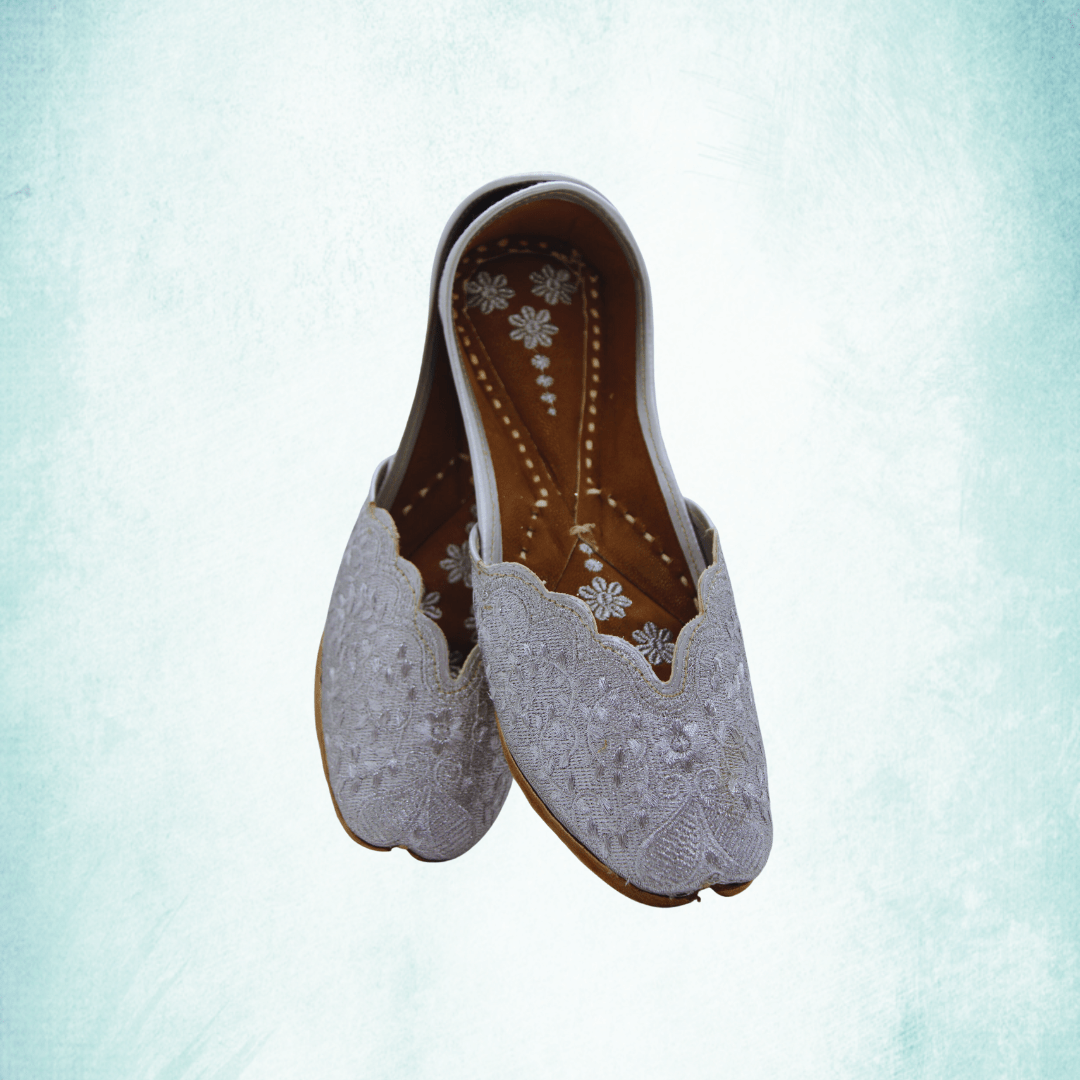 The Nice as Ice Juttis are an all-white pair of shoes with a little sheen, featuring silver and white beadwork with pearls around on an ivory base.