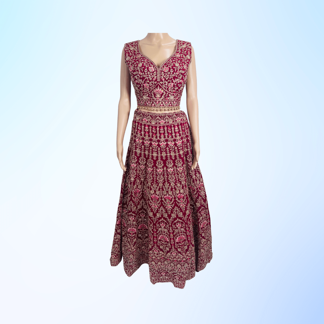 GEORGETTE BASED BEAUTIFUL EMBROIDED STONE AND MIRROR WORK WINE COLOR LEHENGA WITH HEAVY CHOLI COMES WITH CONTRAST DUPATTA FOUR SIDE HAEVY LACE WORK
