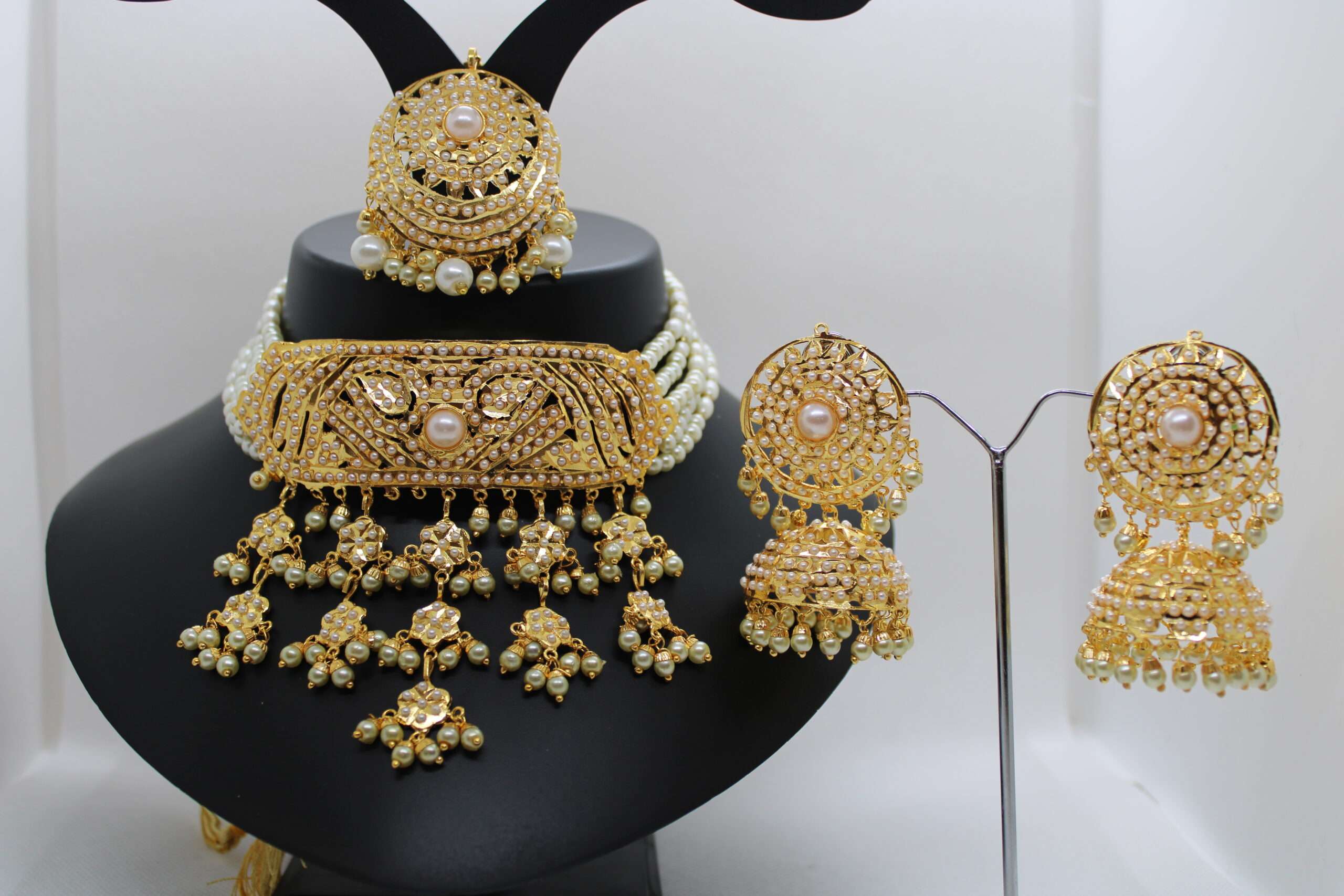 JEWELLERY presents a beautiful Kundan jewelry necklace set with a choker for women, along with a pair of latest design earrings and Maang Tikka combo, which is perfect for wedding occasions. The set is made from good quality stones and pearls, along with a gold plating. It is suitable for wearing at weddings and other special occasions.