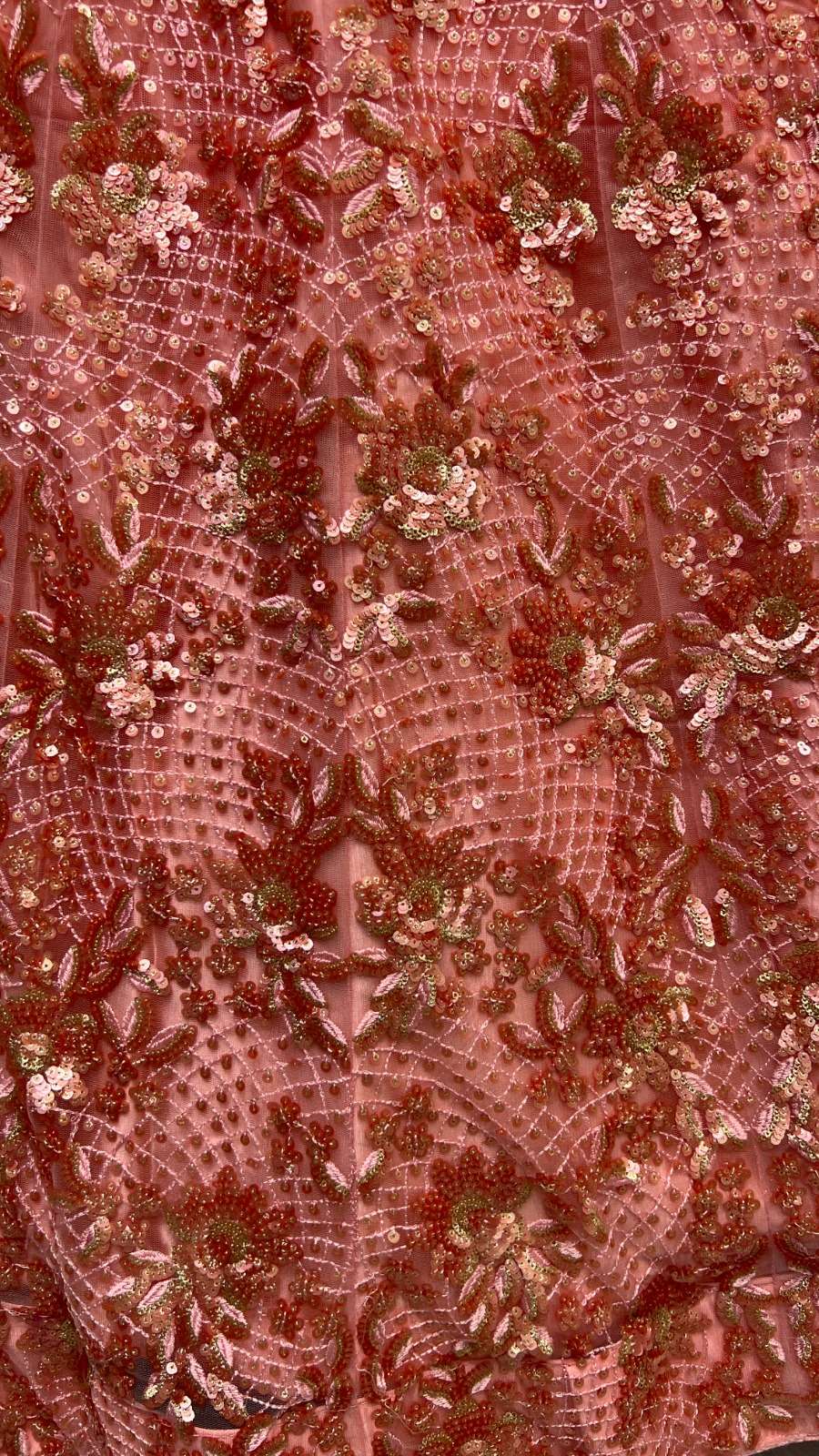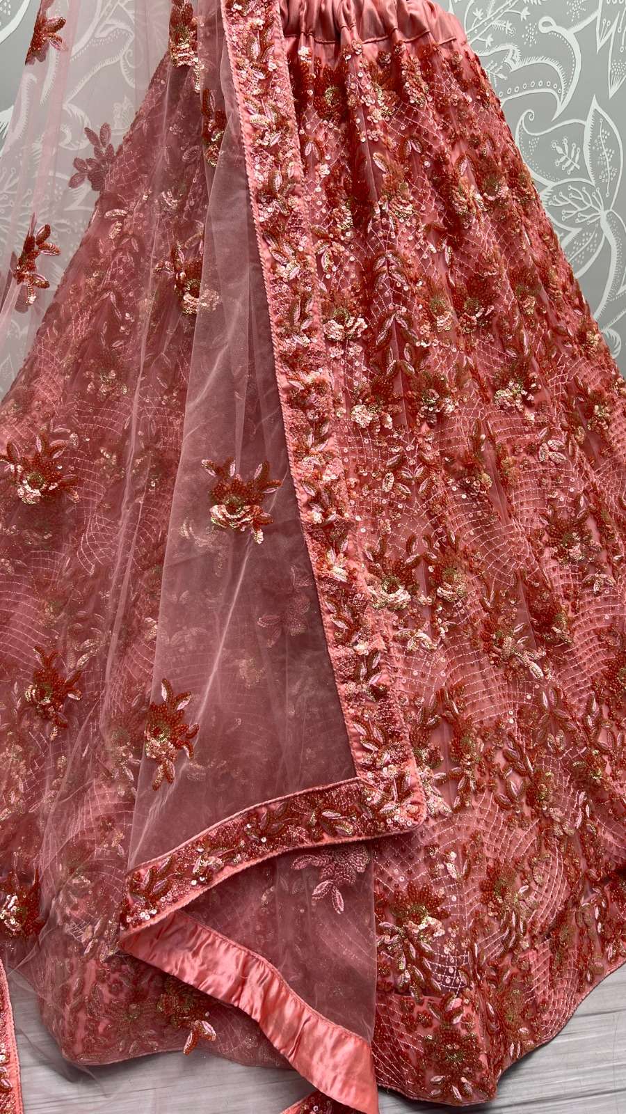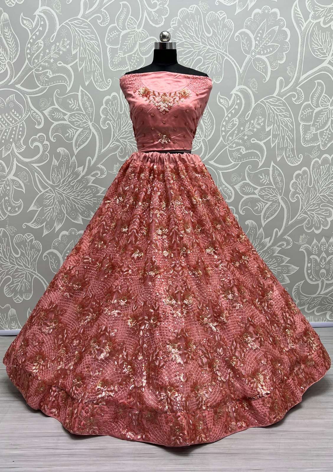 PEACH COLOR DESIGNER LEHENGA NETTING BASED HEAVY EMBROIDERY AND SEQUINCE WORK HEAVY FLARRED CAN CAN COMES WITH HEAVY EMBROIDERY WORK UNSTICHED BLOUSE AND NETTING 4 SIDE EMBROIDERY WORK LACE ON DUPATTA.