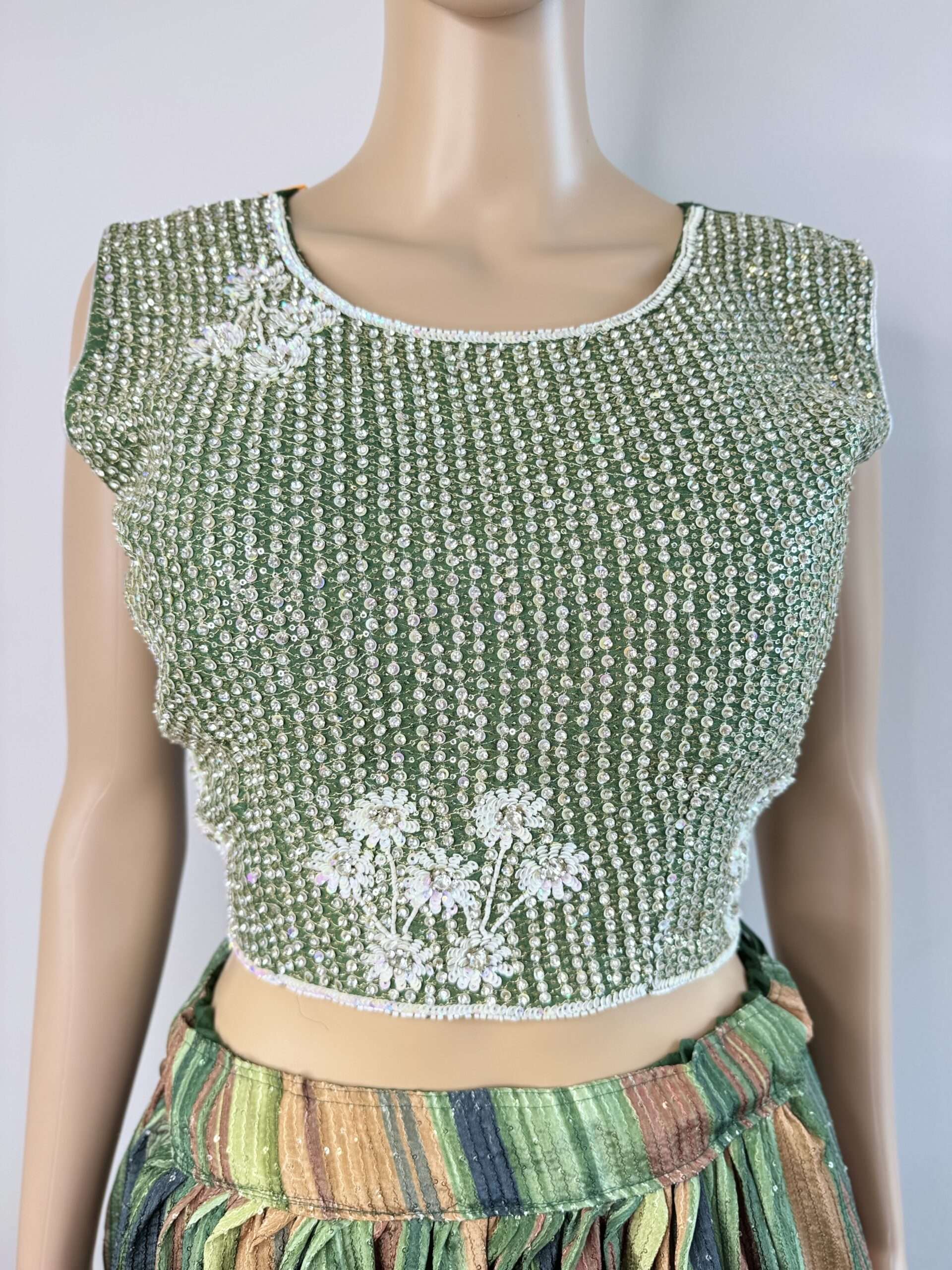 MUTICOLOR GEORGETTE BASED BEAUTIFUL DESIGNER BLOUSE WITH HEAVY STONE AND HAND WORK .FULLY FLARED WITH HEAVY KEN KEN SEQUINCE WORK LEHENGA NET DUPATTA WITH FOUR SIDE LACE WORK.