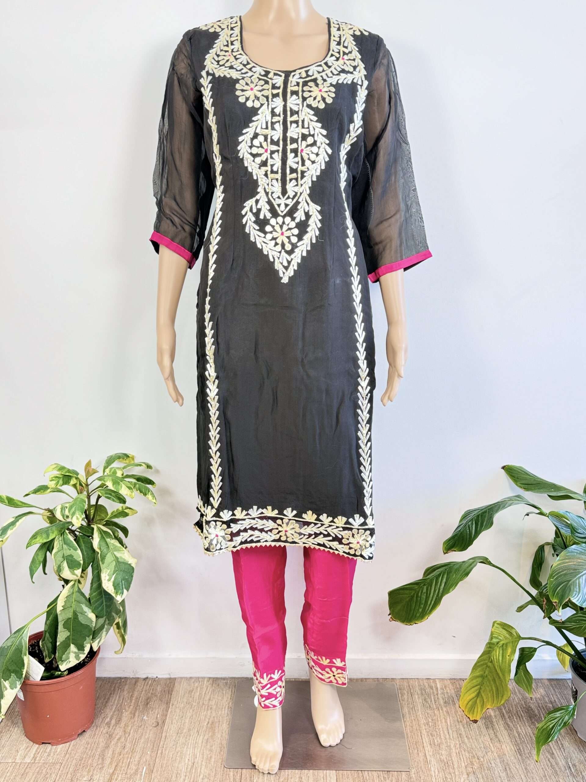 Soft Organza 3D Black, Green and Magenta color. Gota Patti Work Kameez with work on straight pant.