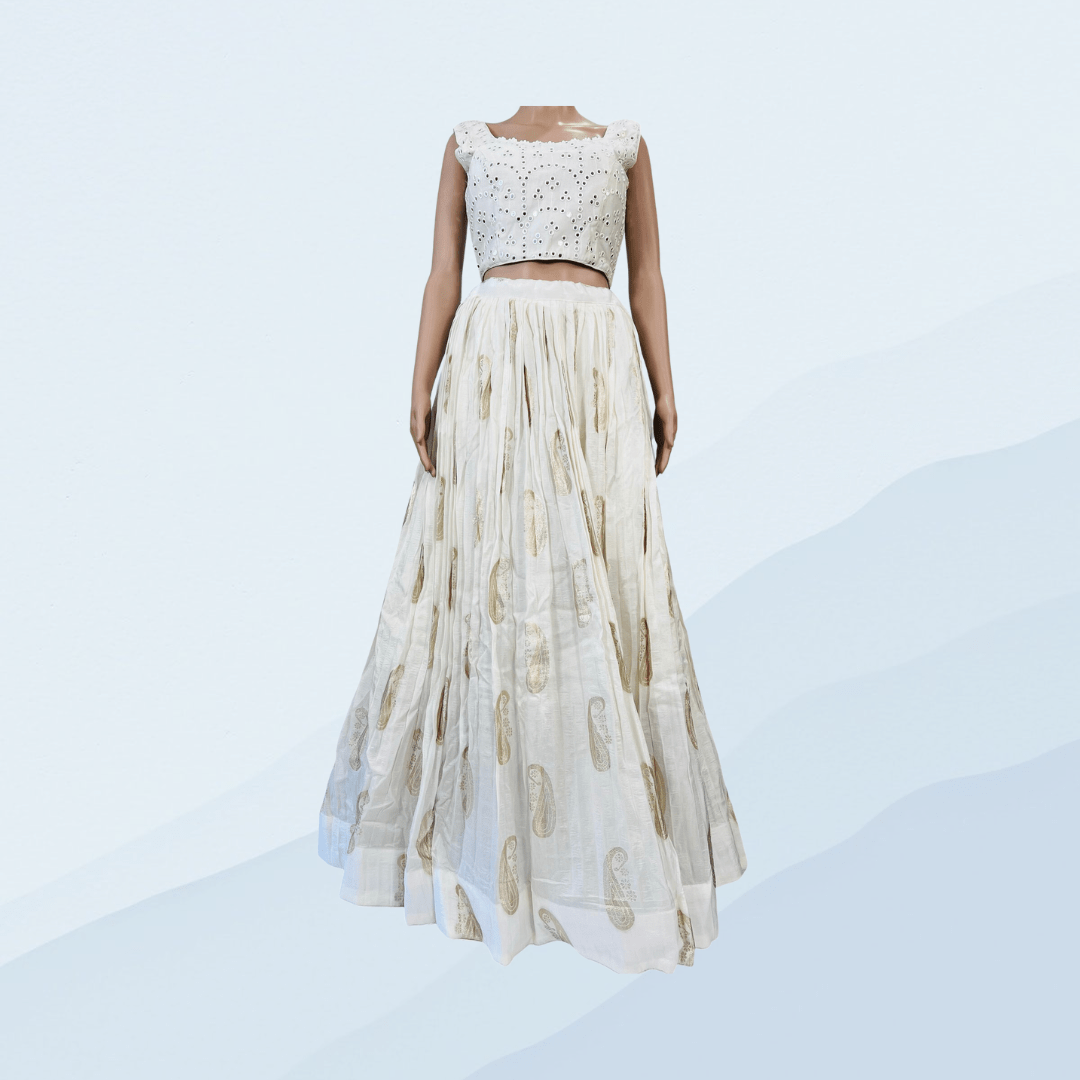 A white crop top set typically refers to a matching outfit consisting of a white crop top and a bottom piece, often a skirt or pants, that complements the top. Crop tops are short tops that expose the midriff or the upper part of the abdomen. They are often paired with high-waisted bottoms to balance out the exposure and create a fashionable and trendy look.