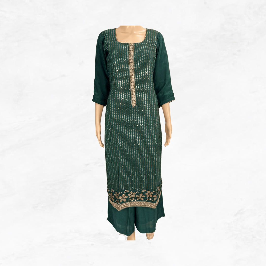 Zari embroidery involves the use of metallic threads, often gold or silver in color, to create intricate patterns on fabric. “Heavy Zari embroidery” suggests that the embroidery work on the suit is elaborate and rich in design.